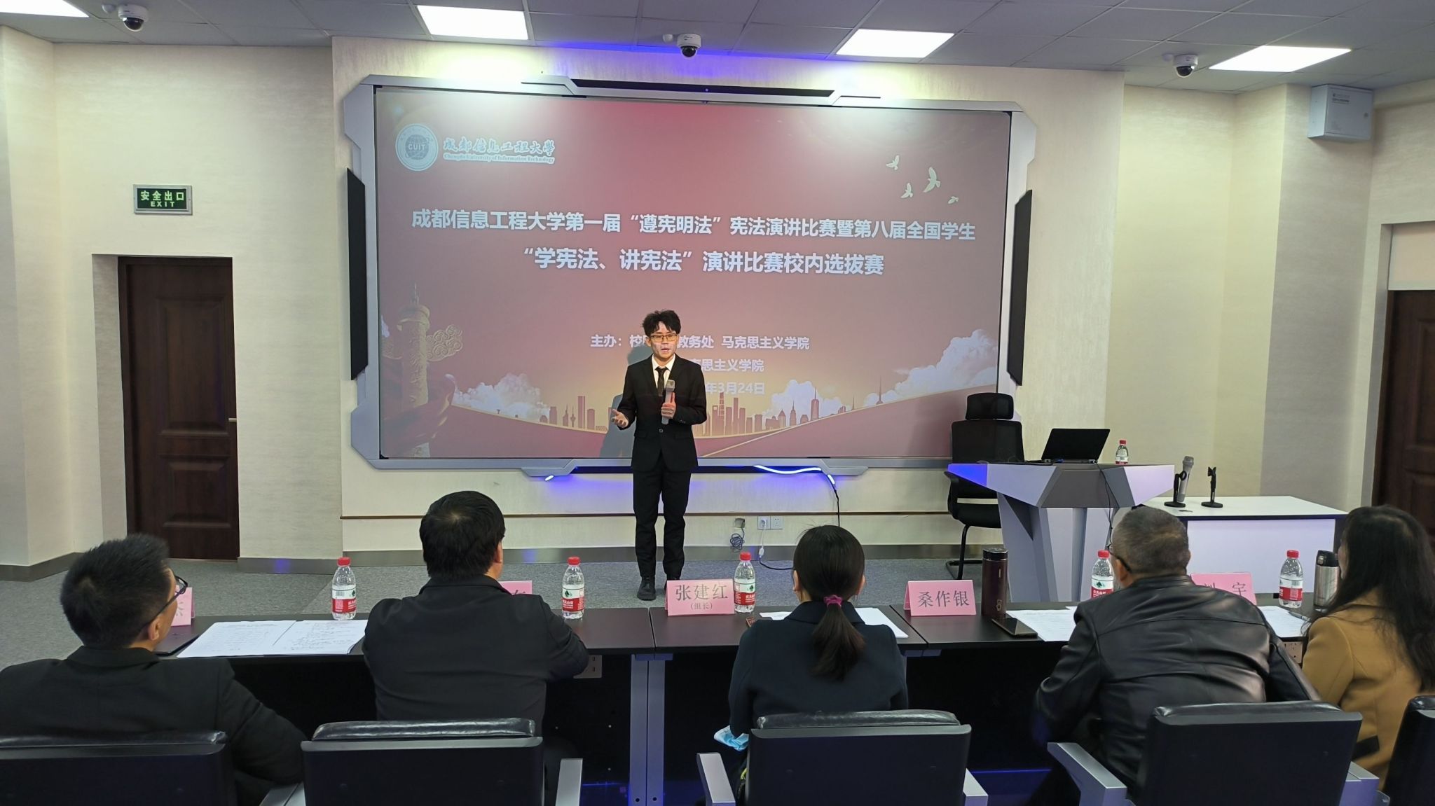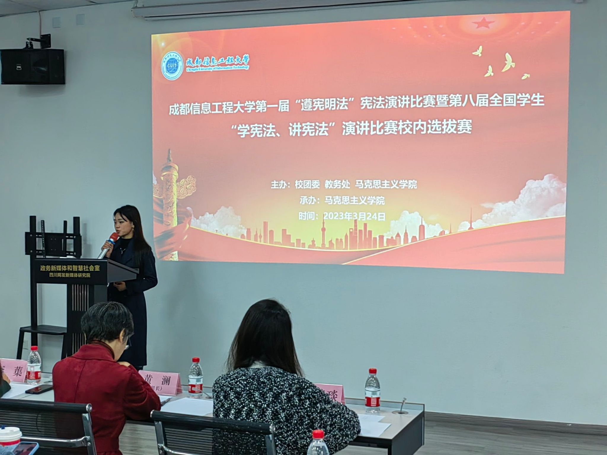 第一届“遵宪明法”宪法演讲比赛暨第八届全国大学生“学宪法、讲宪法”演讲比赛校内选拔赛在航空港校区四川省网信人才培养基地(第三教学楼)3201教室、3202教室进行。