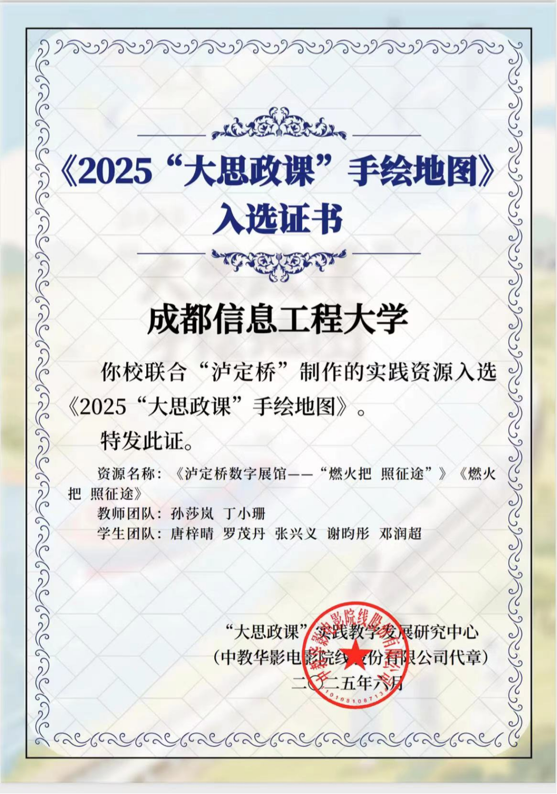 教师团队孙莎岚、丁小珊共同指导,由学生唐梓晴、罗茂丹、张兴义、谢昀彤、邓润超联合申报的高校思政课实践教学资源《泸定桥数字展馆——“燃火把 照征途”》从全国众多项目中脱颖而出,成功入选。此次成果是对我校创新思政课教学模式、推动实践育人成效的充分肯定。