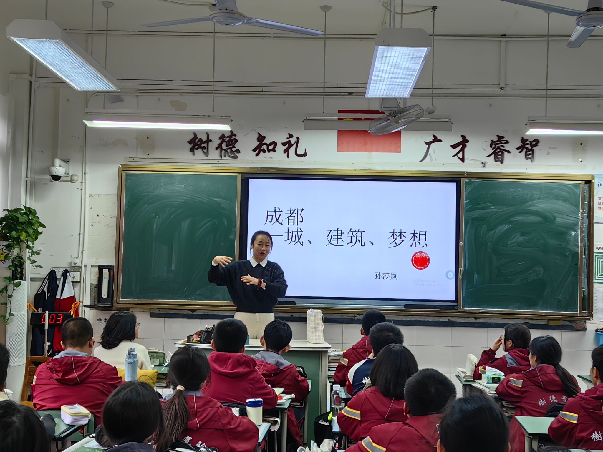 副院长孙莎岚走进成都树德实验中学(西区),为九年级三班的同学们带来一堂别开生面的思政公开课。课堂以“成都:城、建筑、梦想”为主线,串联起城市记忆、家国情怀与青春梦想,思政教育在“沉浸式”体验中悄然发生。