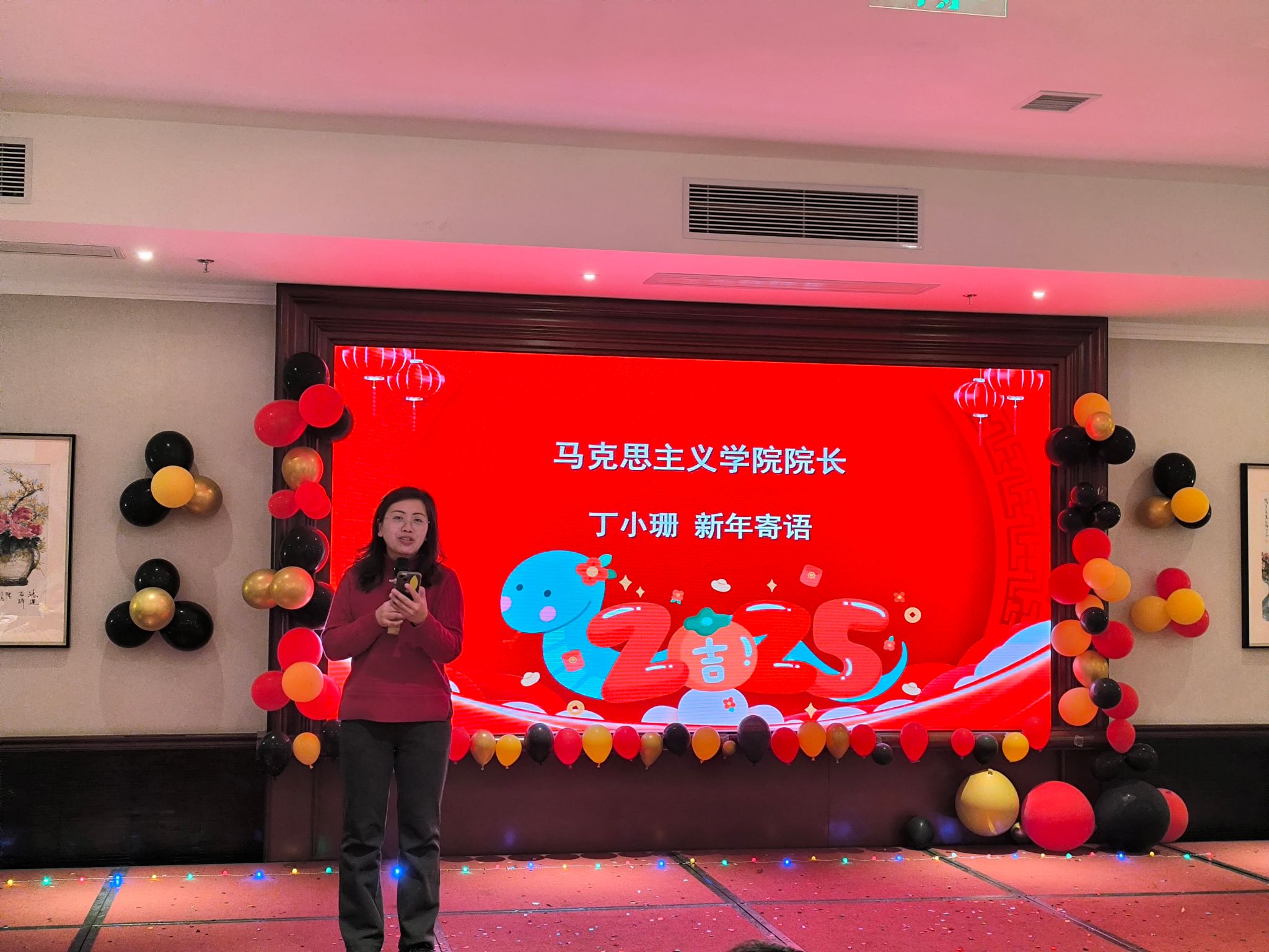 联欢会最后,院长丁小珊发表新年寄语,她指出,过去的一年,全体教师孜孜不倦,无私奉献;全体同学勤奋乐学,桃李争妍,书写了马院既不平凡又硕果累累的2024年大写的“龙”字!她指出,新的一年,新的使命,新的希望。我们要牢记“公共课是基础,硕士点是根本,特色是水平”的马院发展思想,高质量完成2025年党建、教学、科研等任务,迎接即将到来的硕士点合格评估和新一轮省社科研究平台验收。